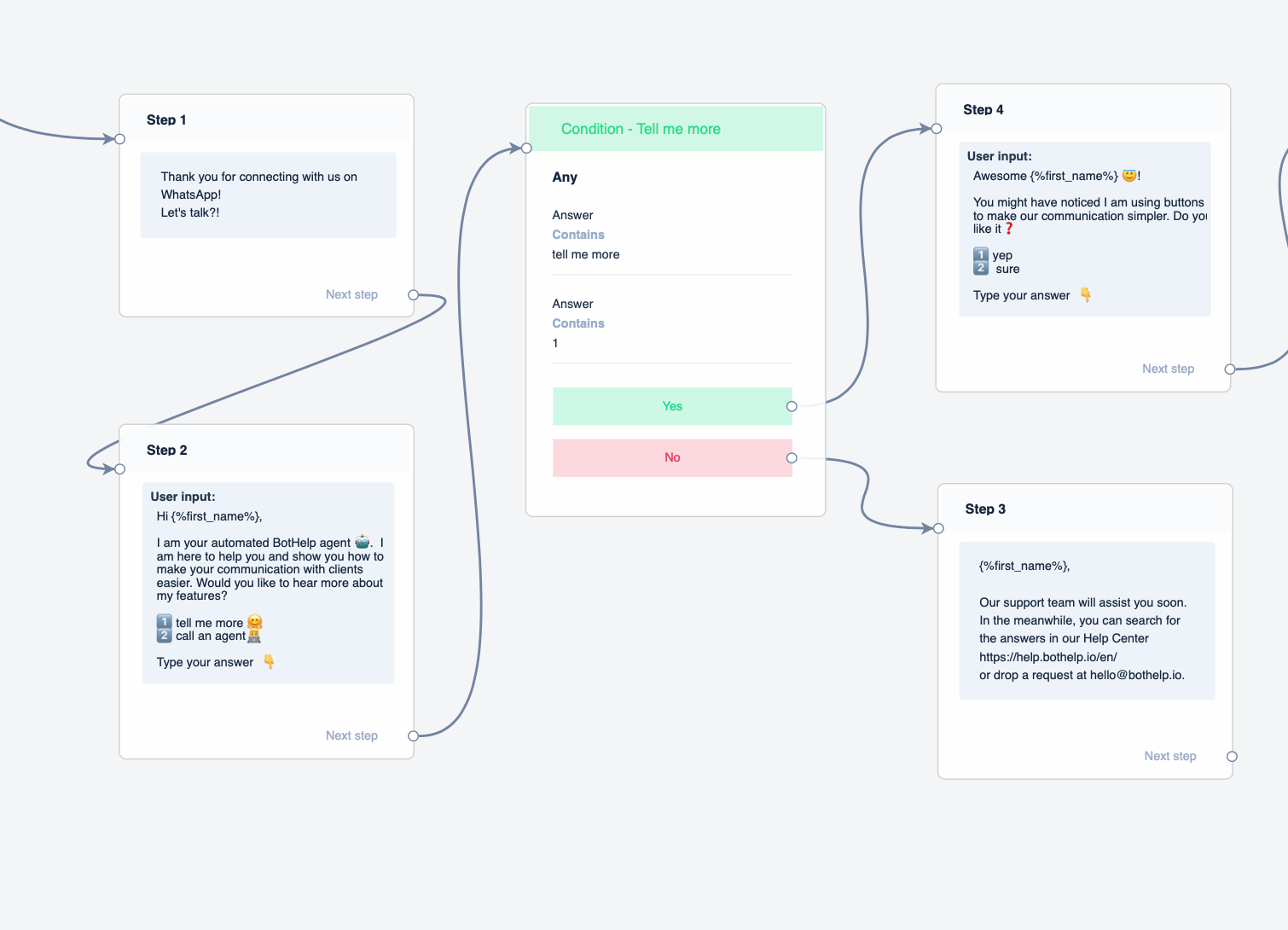 It looks a little bit different for WhatsApp. On the WhatsApp flow we don’t use buttons. We use conditions to forward a user to one of other flows.