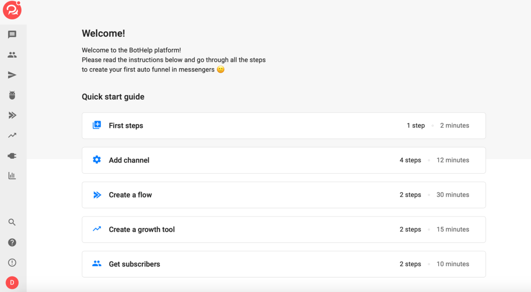 When you register on BotHelp, you will find useful information on how to start working with the platform. Also, you will receive onboarding emails explaining all the tools available on the platform. In addition, you can watch videos on our YouTube channel.
