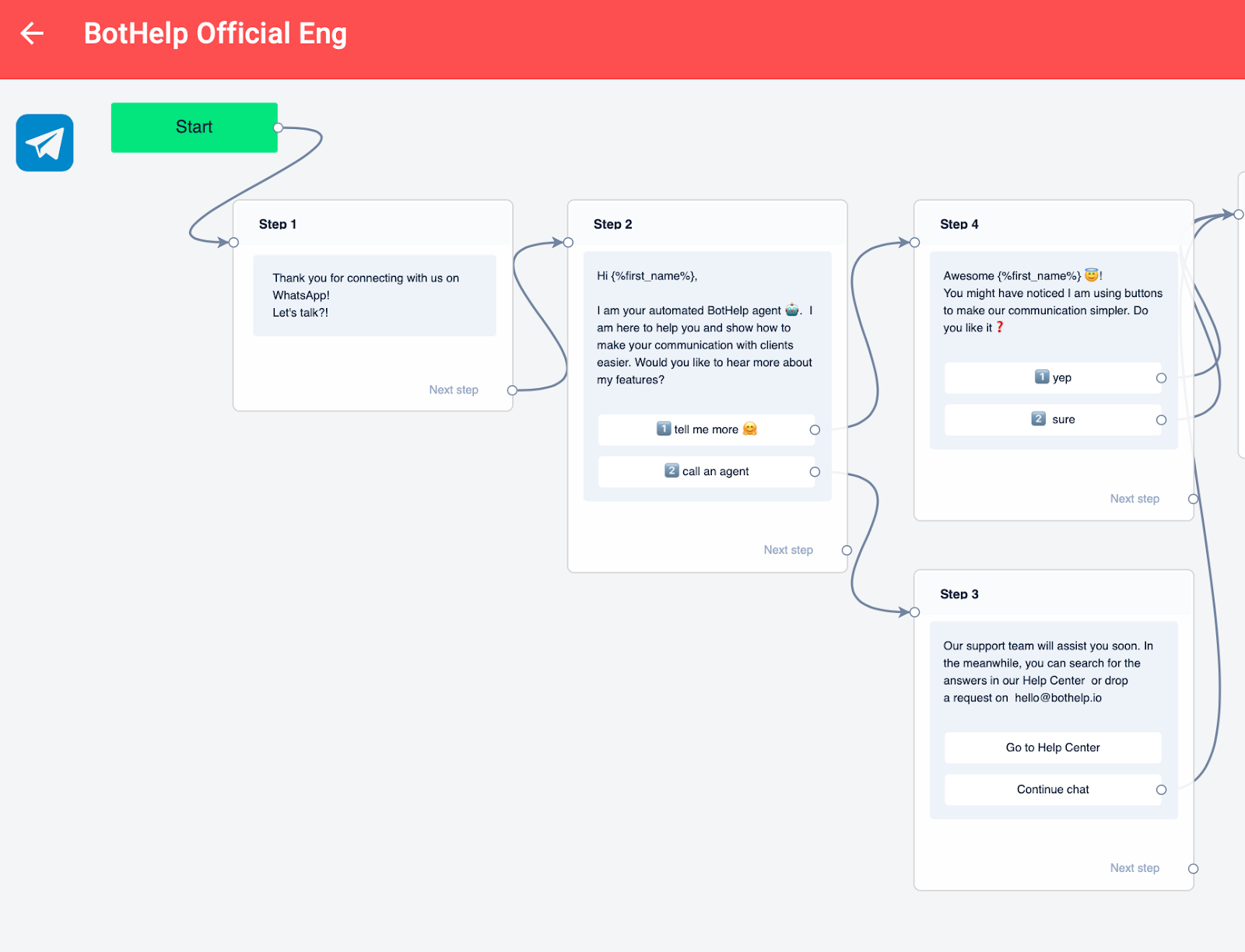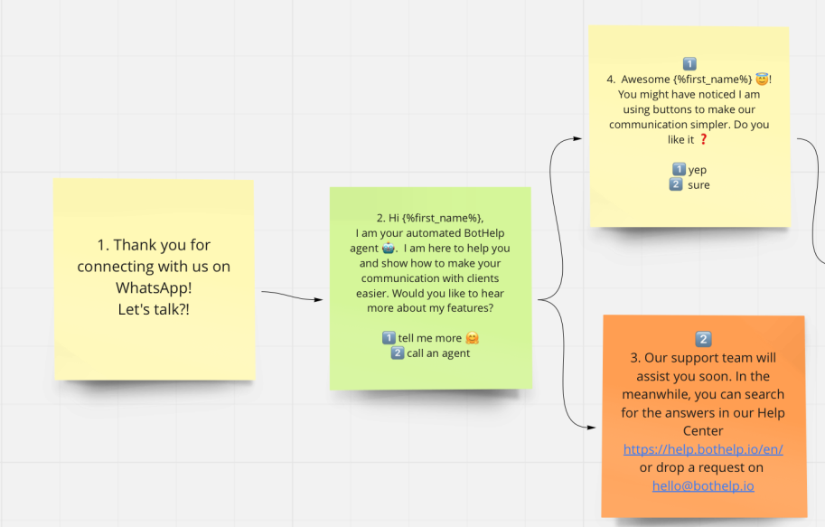 Having a visual map of your funnel, you can easily and quickly transfer it to the BotHelp platform, as well as show and discuss it with your colleagues.