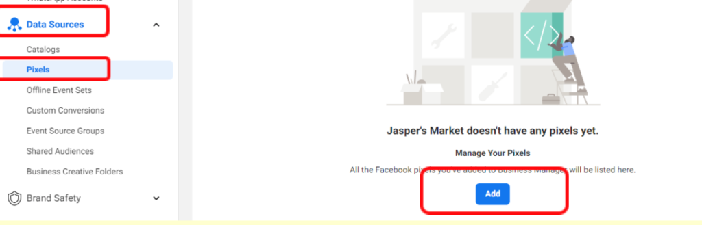 To add pixel to your Business Manager: Click on “Data Sources” => Select “Pixels” => Click the “Add” button =>