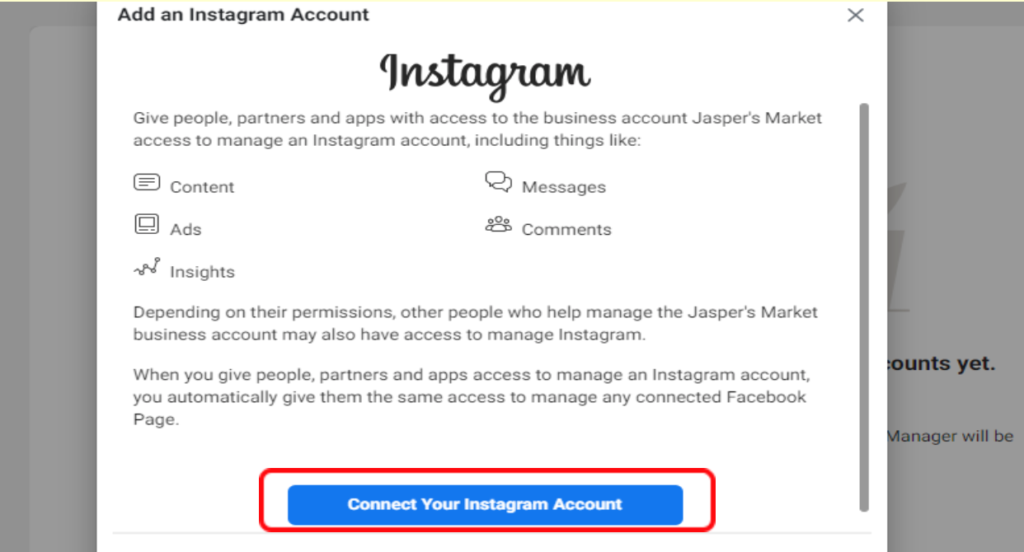 When you click add, it will redirect you to another dialogue page where you can connect to your Instagram* account. Click on the “Connect Your Instagram* Account” and fill in your Instagram* credentials.
