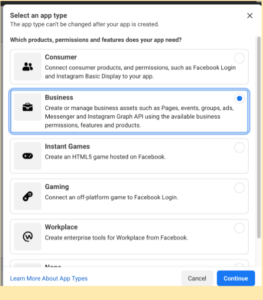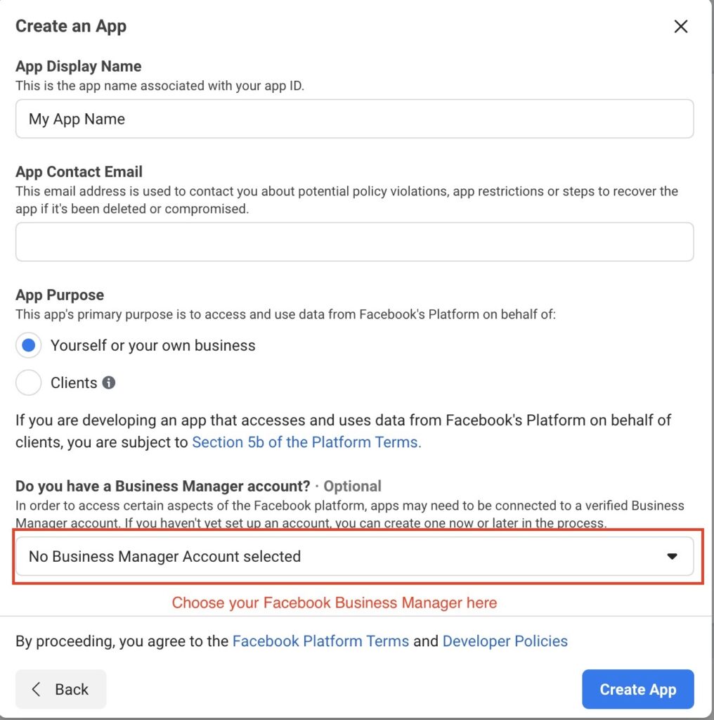 4. Input the following details: your email address, app name and purpose of the account. Then select your Facebook Business account* from the drop down menu and select ‘Create App’.