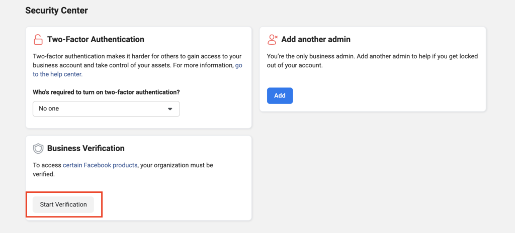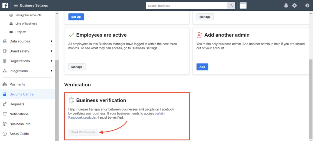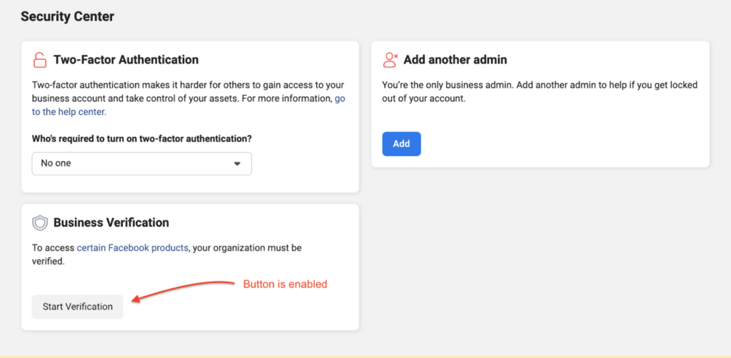 5. You’re done. You can come back to the Facebook Business Manager* –> Security Center and the ‘Start Verification’ button shall be enabled