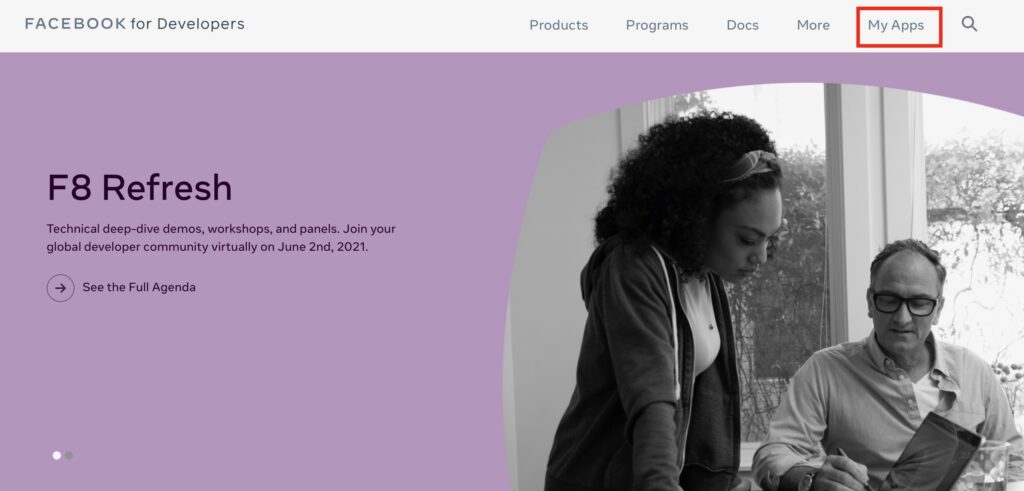 1. Visit Facebook* Developers page. Select ‘get started’ or ‘My Apps’ displayed in the top right corner
