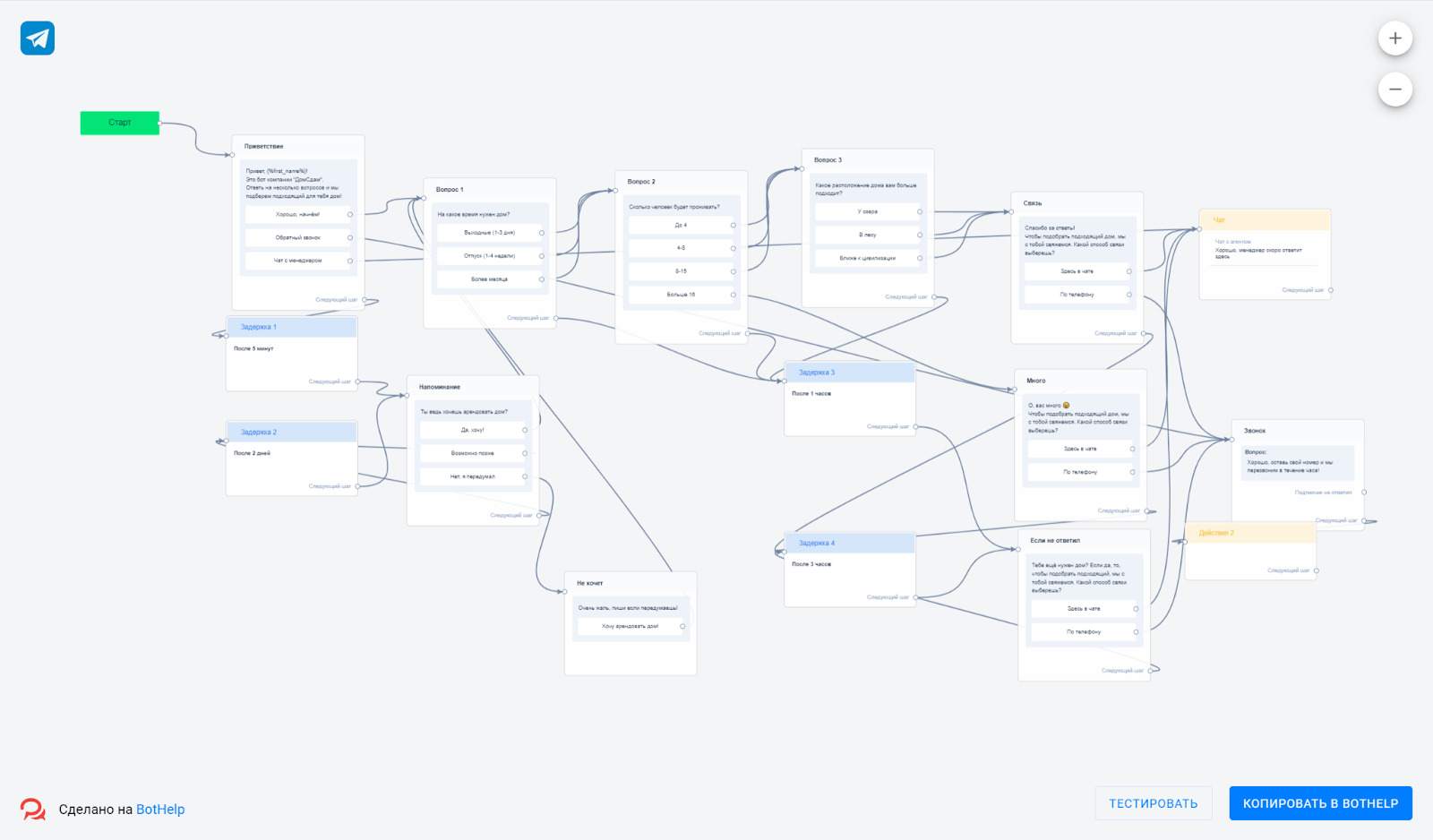 Пример автоворонки в недвижимости — чат-бот «Сдача домов в аренду». Шаблон легко переделать под посуточную аренду квартир или автомобилей, модернизировать — добавить сообщение со ссылками на соцсети или предложением посмотреть фотографии.