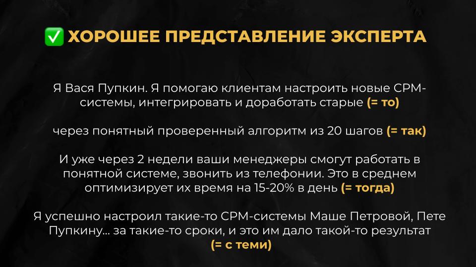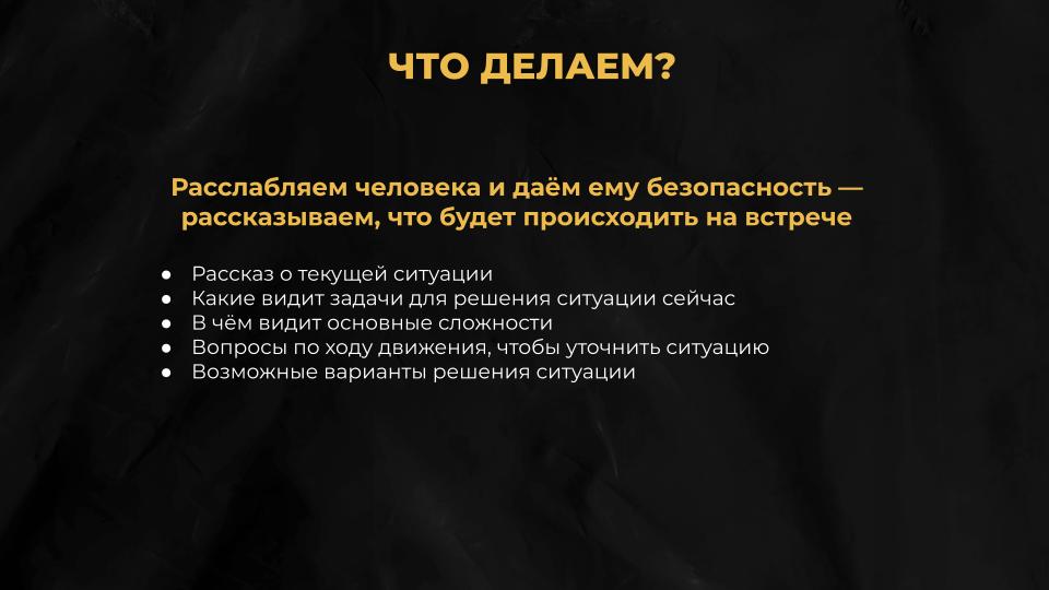 Такая микропрезентация важна, потому что, если клиенту на консультации непонятно, что вы делаете, он уйдёт в закат. А так часто бывает, особенно у начинающих специалистов с этим всегда проблемы.