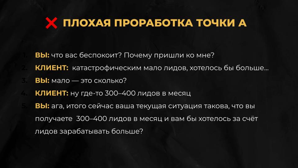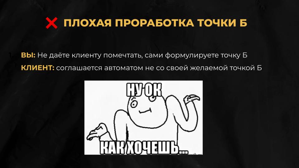 Плохая проработка точки Б: не даём клиенту помечтать, сами формулируем, он соглашается автоматом не со своей желаемой точкой. Вроде хотел, но на самом деле не этого, и клиент уходит в закат.