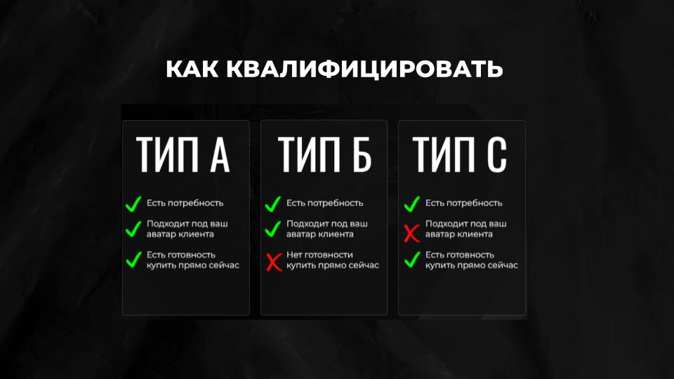 Квалификация — это обязательный шаг, делайте его в момент переговоров, когда клиент оставил какую-то заявку, как-то с вами прокоммуницировал. Это суперважно. Если проводить консультации со всеми подряд, то вы просто будете выгорать, сливать время и деньги.