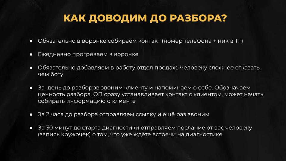 По нашей статистике, в среднем нужно 12 касаний для того, чтобы человек купил что-либо. Вы сами или отдел продаж за день до диагностики должны напомнить клиенту о встрече на консультации. Позвонить или написать: напомнить о себе, обозначить ценность консультации/разбора.