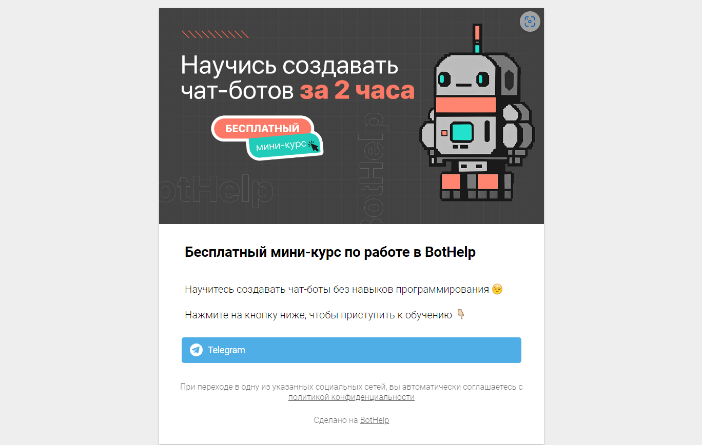 Например, у BotHelp есть бесплатный мини-курс по работе с нашей платформой: сможете научиться создавать чат-ботов за 2 часа. Переходите по ссылке, чтобы приступить к обучению.