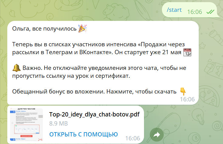 Чаще всего автоворонка бывает в виде серии сообщений в мессенджере. В сообщениях компания знакомит пользователя с брендом и продуктом, подогревает интерес к продукту.