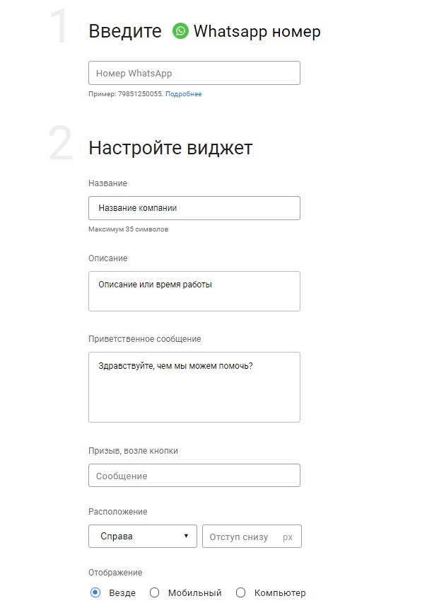 - Введите номер WhatsApp. Настройте виджет чата на сайте — укажите название компании, добавьте описание или время работы, а также приветственное сообщение. Не забудьте добавить призыв, возле кнопки. И укажите расположение виджета чата на сайте.