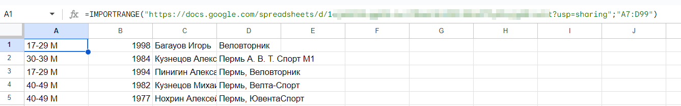 Для решения этой проблемы была создана вторая таблица. Которая брала данные из основной таблицы с помощью функции IMPORTRANGE. И уже эту «урезанную» таблицу мы показывали подписчикам. А полную таблицу мог видеть только организатор.