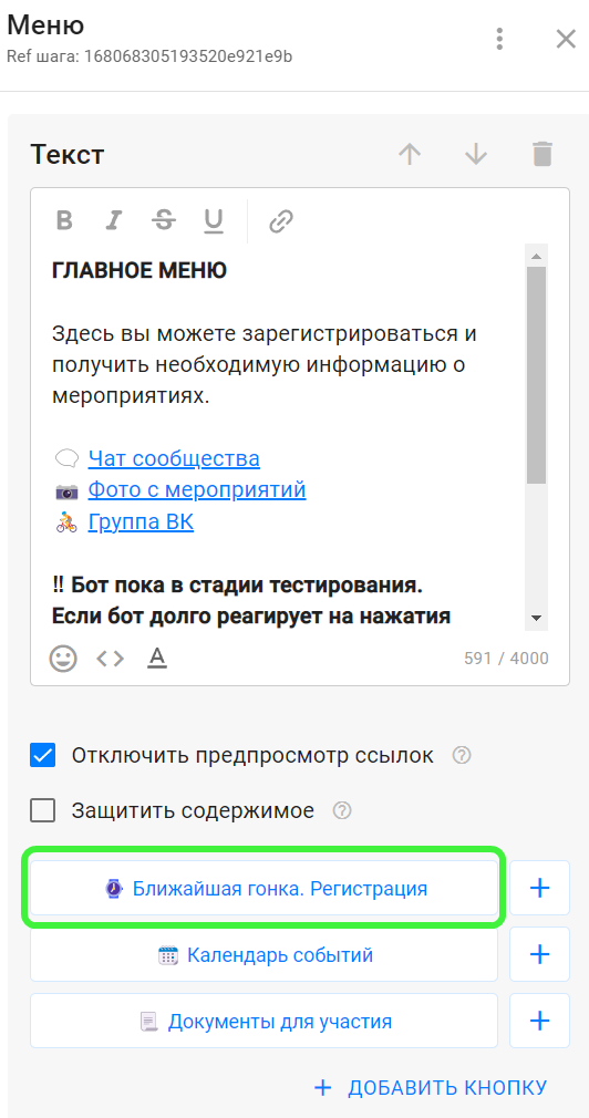 Для перехода к регистрации в главном меню бота нужно было нажать на кнопку «Ближайшая гонка», затем приходил второй раздел меню, где уже была информация о мероприятии и кнопка «зарегистрироваться».