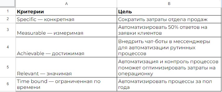 Цель может выглядеть так: Чат-бот должен разгрузить отдел продаж, отвечая на 40% вопросов в первые 3 месяца после внедрения.