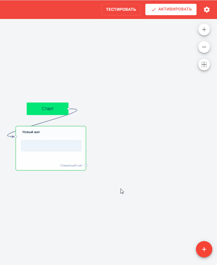 - Сразу же после создания бота вы попадаете в конструктор чат-ботов. Там вас уже будет ждать один «Стартовый шаг» и «Новый шаг» (первое текстовое сообщение, которое бот присылает подписчику).