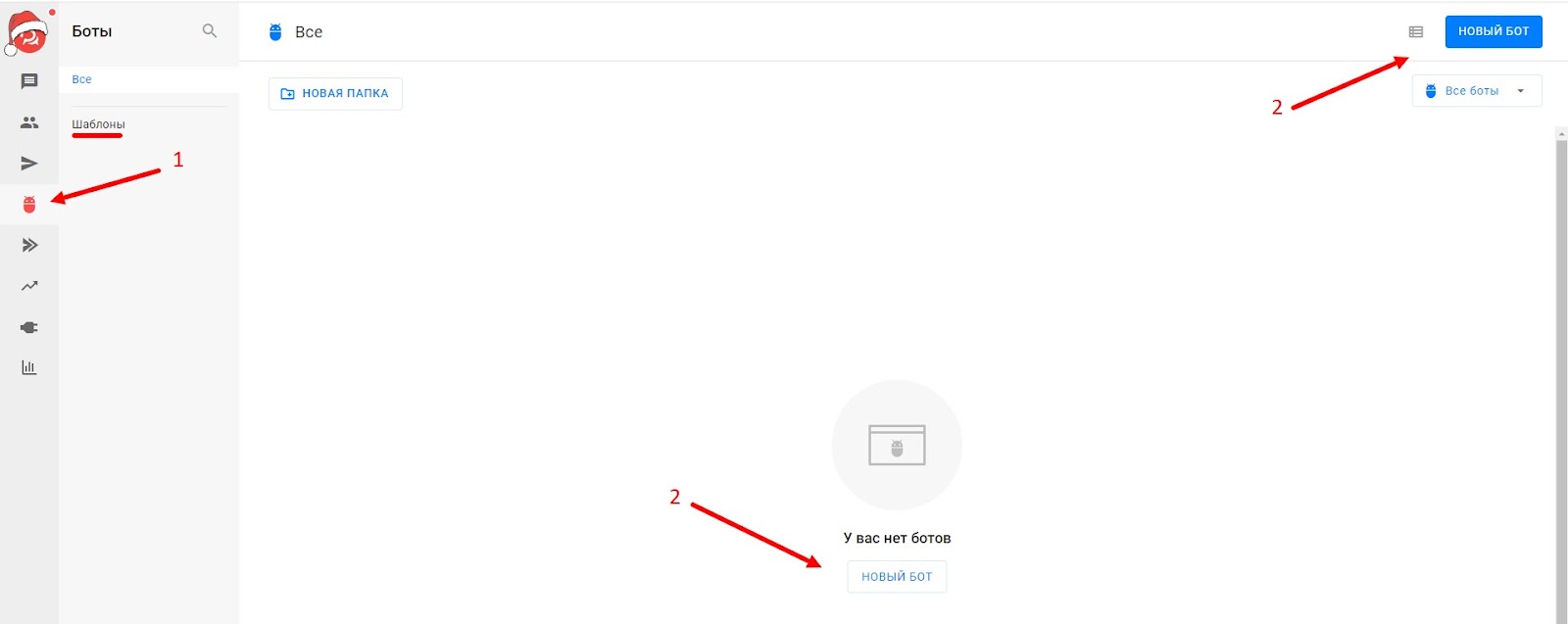 - Теперь создайте чат-бота. Выберите в левом меню «Боты» → «Новый бот». Или выберите шаблон в меню слева.
