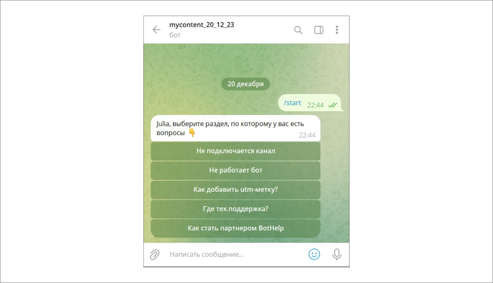 Подробнее о сценариях чат-бота и о типах сообщений, которые он может отправлять, читайте в инструкции в «Базе знаний BotHelp» https://help.bothelp.io/sozdaem-sczenarij-bota-chast1/