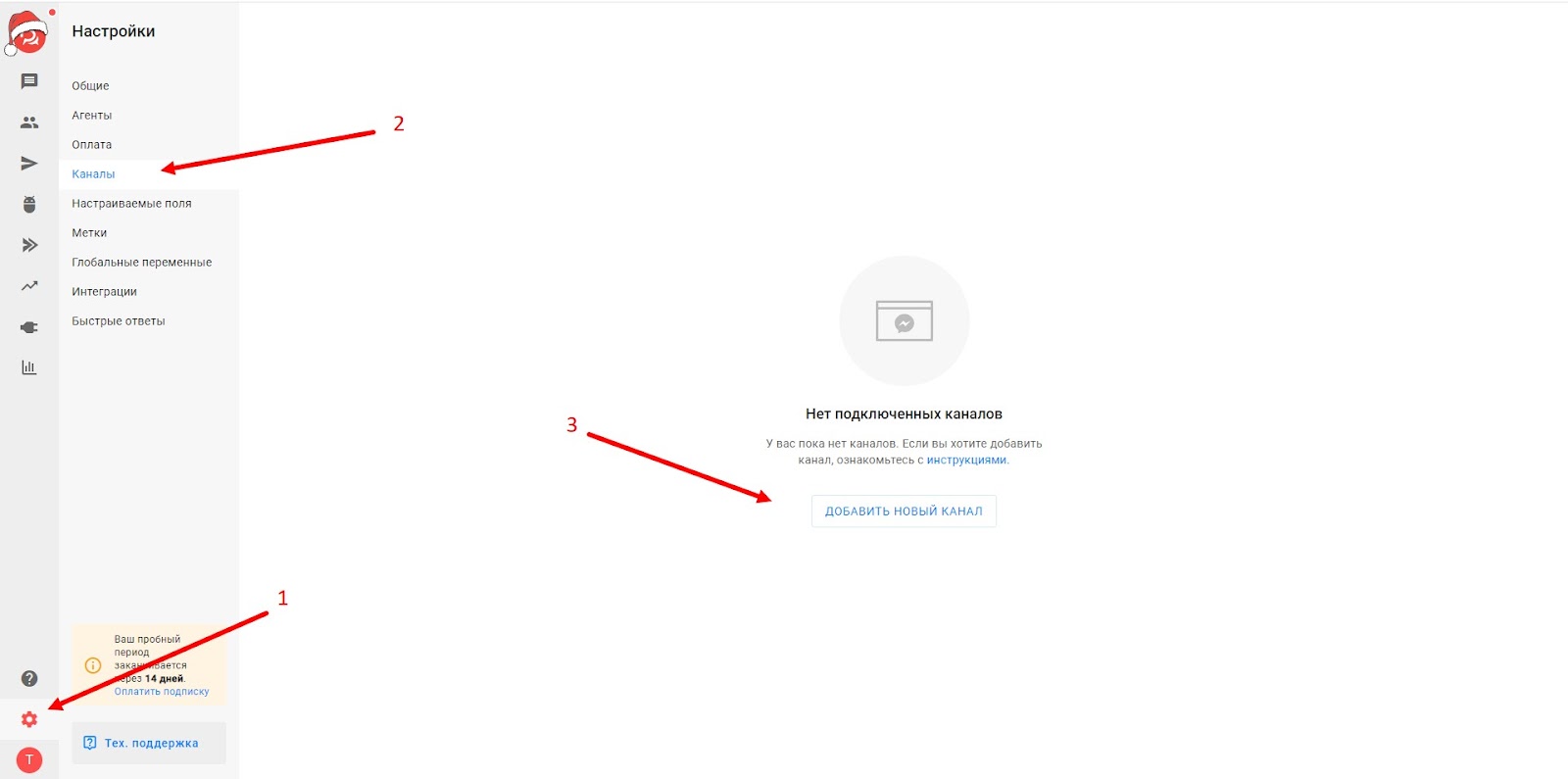 - Теперь подключите к платформе канал/мессенджер. Например, это будет Telegram.
