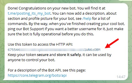 Это токен (секретный ключ) вашего бота. Никому его не передавайте. Скопируйте токен.
