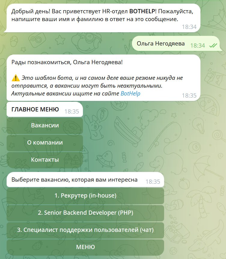 Соберите такого бота за считаные минуты без разработки кода. Используйте шаблоны BotHelp: сбор лидов и сегментация и сбор телефона и email.