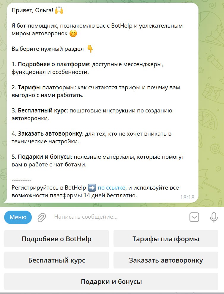 Если вы хотите создавать чат-ботов, зарегистрируйтесь в BotHelp. У вас будет 14 дней бесплатного доступа ко всем функциям, чтобы протестировать все возможности сервиса.