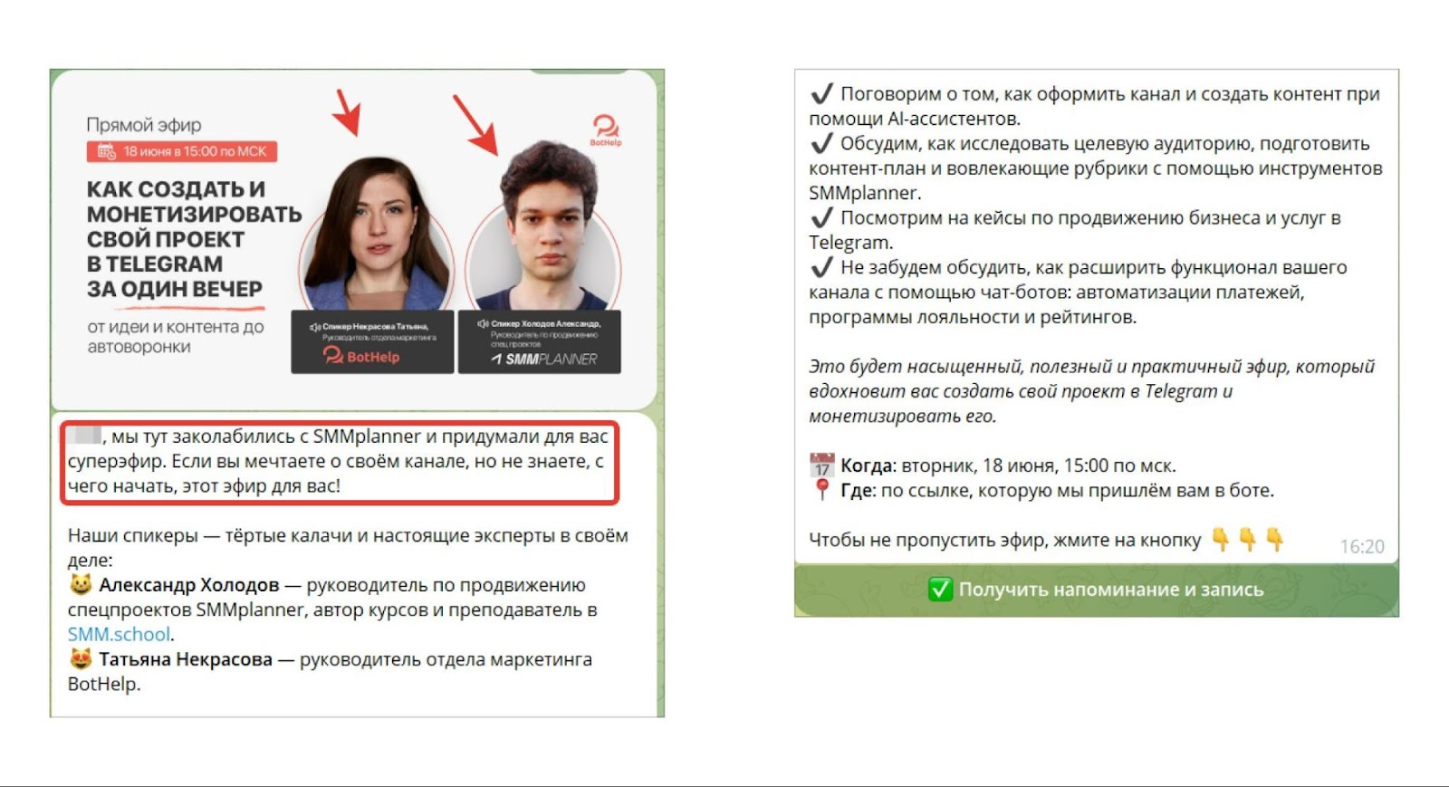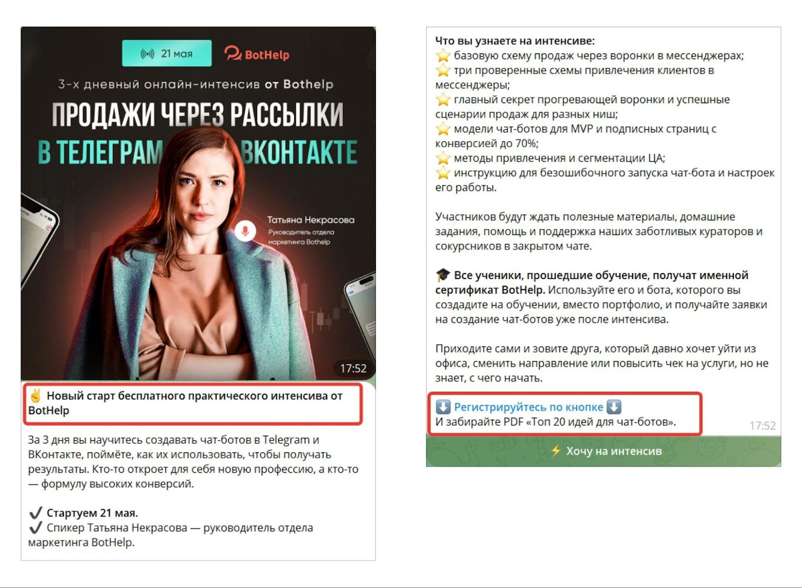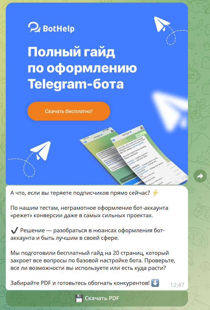 Например: «Переходите по ссылке и получите бесплатный мини-курс по созданию чат-ботов. Начните зарабатывать прямо сейчас!»