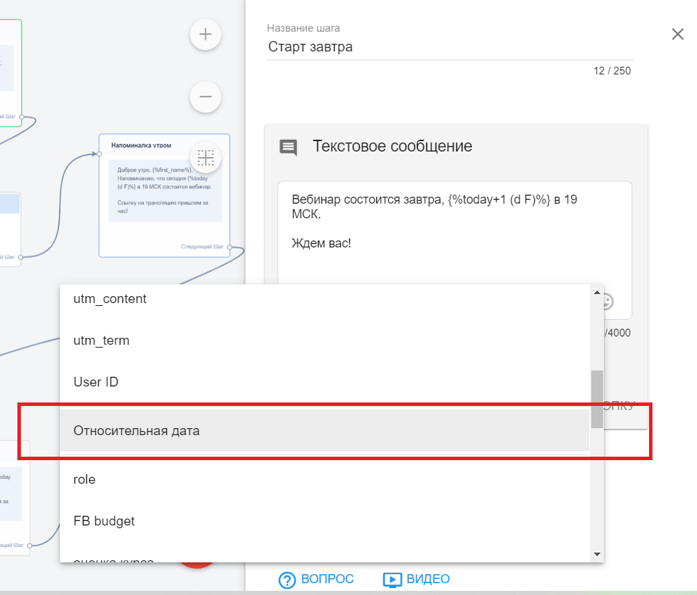 В сообщениях платформы есть макрос относительной даты {%today+1 (d F)%}, который позволяет в нужном формате вставить дату в сообщения рассылок. Таким образом, подписчики будут видеть конкретные даты проведения курса или мастер-класса.