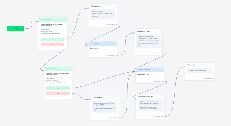 Для построения evergreen воронки в боте необходимо сразу после старта добавить условие по проверке текущего времени. И если оно, например, больше 19:00 по МСК, то отправляем человека по цепочке “старт завтра”. Если же на данный момент время меньше 19:00, то осуществляется переход к следующему условию — где правило «текущее время больше 18:00», при соответствии указанным правилу человек переход к сообщению “ за 10 минут до эфира”. И если и это условие не выполняется, то человек получает сообщения, что вебинар состоится «сегодня», потом напоминание за 1 час и т.д.
