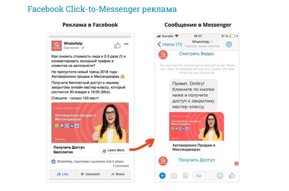 Когда клиент кликает на рекламу в ленте Facebook или Instagram, он попадает сразу на бот в Facebook Messenger, минуя минилендинг. Конверсия в подписку ≈ 30-65%. Facebook Click To Messenger Ad — это отличный выбор для таргетинга на мобильную аудиторию. Алгоритмы фейсбука будут оптимизировать и показывать вашу рекламу только тем, кто использует мессенджер.