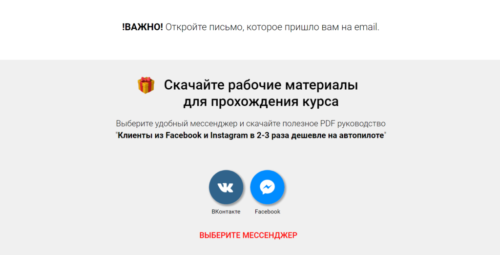Человек проходит регистрацию, указывает свой e-mail и телефон, и попадает на страничку благодарности, где ему предлагаем выбрать мессенджер для получения бонусов.