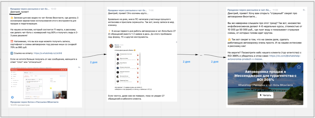 Цепочка сообщений должна быть проработана с учетом того, насколько заранее начинает литься трафик. В наших воронках задержка между прогревающими сообщениями составляет около 2 дней.