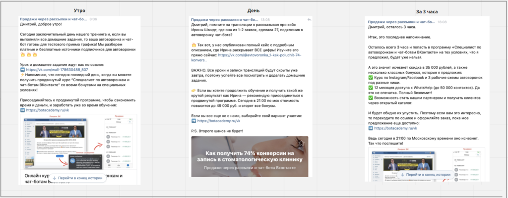 Например, в BotAcademy — это сообщения с видеозаписями о том, как работают чат-боты, минилендинги, с крутыми кейсами наших партнеров с подробным описанием проблемы клиента и ее решения — как удалось снизить стоимость заявки, получить заявки на несколько месяцев вперед… Также предложение приобрести запись курса, мастер-класса и бонусы.