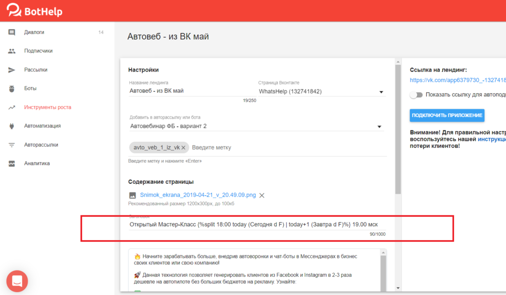 Это внутреннее приложение ВК, которое подключается к группе, и с помощью которого будут отправляться потом сообщения. Здесь также можно установить относительную дату, которая позволяет настроить разделение показа даты в зависимости от времени, когда человек попал на страничку.