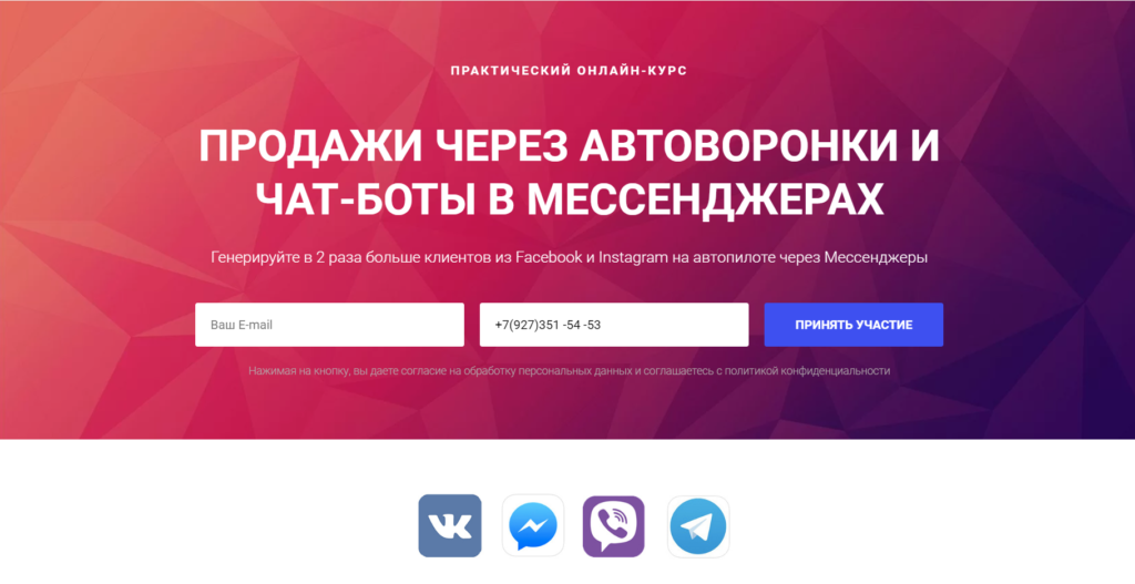 Макросы здесь работают точно также. Единственная особенность это то, что на выбор предлагается несколько мессенджеров — Вконтакте, Facebook, вайбер, телеграм. Обычно конверсия на минилендингах равна 30-50 %