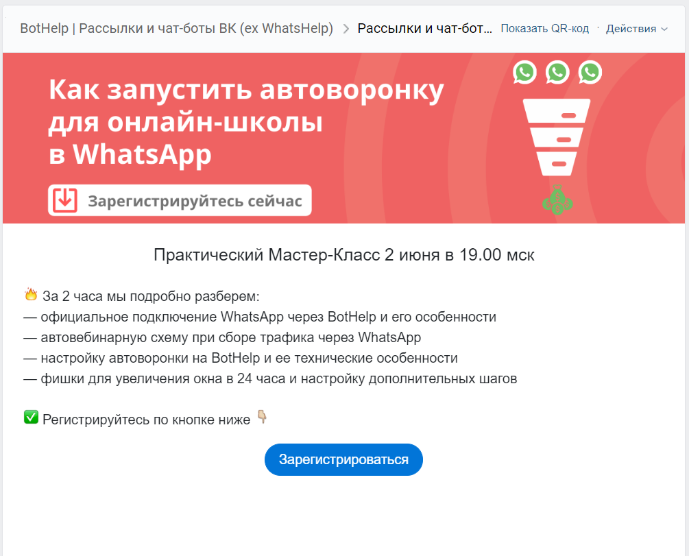 С объявлений ведем людей не на внешние сайты, а на подписную страницу, созданную в платформе BotHelp в разделе “Инструменты роста”. Регистрация на мастер-класс проходит сразу после клика на кнопку и соглашения получать от нас сообщения.