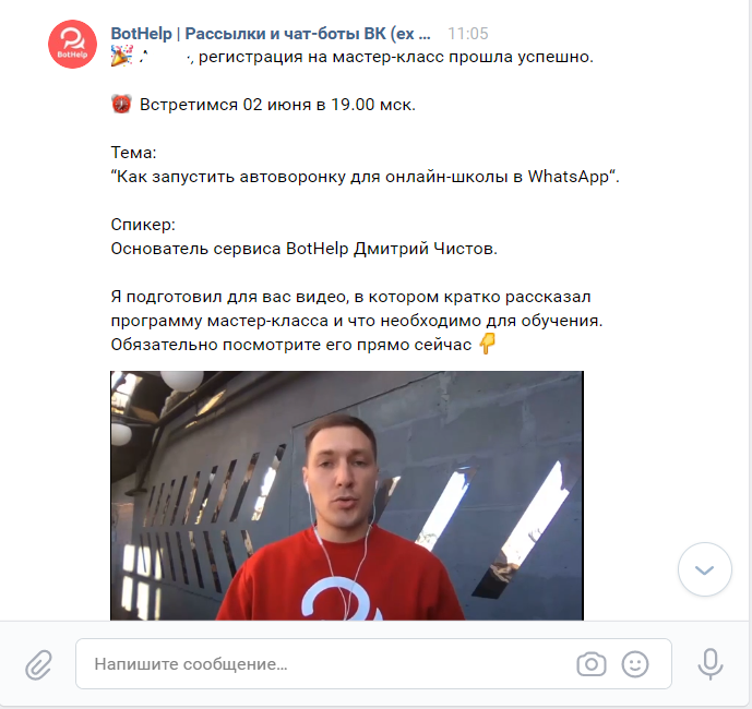 - 3-4 сообщения в день эфира. Утром еще раз напоминаем о мастер-классе, указываем другие выгоды его посещения, затем отправляем ссылку на эфир за 1 час и за 10 минут до начала трансляции. Если есть запись, отправить ее можно в этот же день после завершения эфира или на следующий день утром.