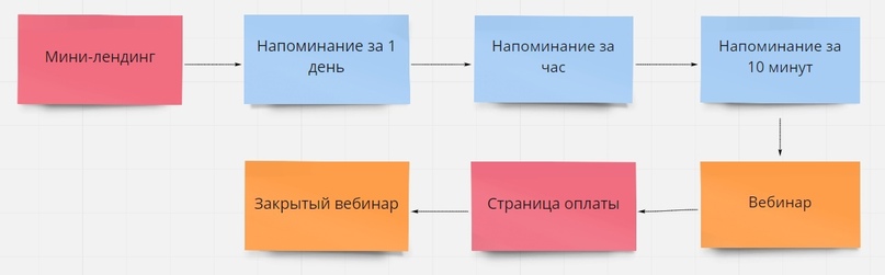 Составили простую схему: мини-лендинг – напоминания за день/час/10 мин., запись вебинара с ассортиментом косметики и приглашением на закрытый вебинар.