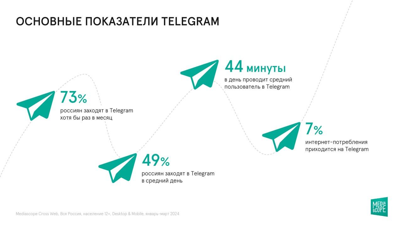 По последним исследованиям Mediascope, среднесуточная аудитория Telegram в I квартале 2024 года составила 49%, то есть почти половина населения России использует этот мессенджер хотя бы раз в день.