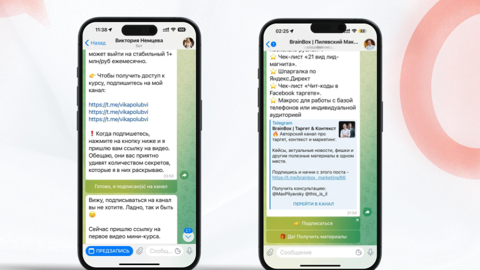Суть сценария: вы ведёте аудиторию с рекламы на чат-бота, прежде чем выдать обещанный в оффере бонус, чат-бот проверяет подписку на Telegram-канал и только после этого выдаёт лид-магнит.