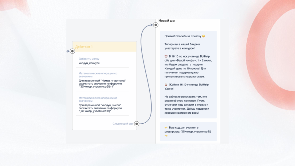 Слева вы видите блок «Действие». С помощью него вы можете присваивать участникам метки (они помогают сегментировать аудиторию) и индивидуальный номер участника с помощью математических операций.