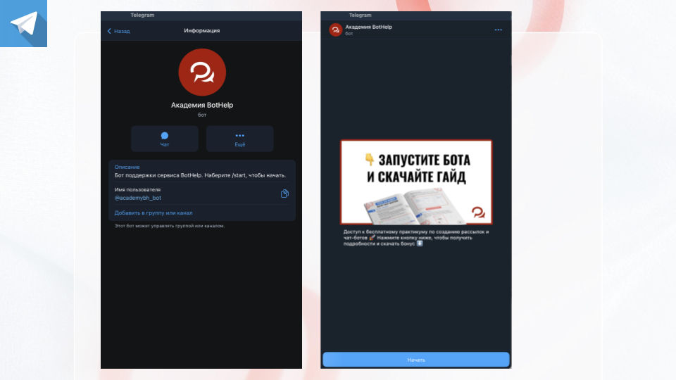 Мы сделали для вас полный гайд по оформлению Telegram-бота. Забирайте бесплатно по ссылке.