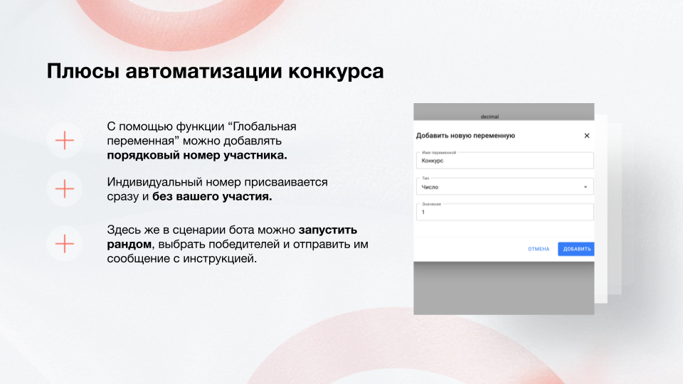 Суть сценария: человек видит конкурсный пост в ваших соцсетях, главное условие участия — пройти регистрацию в вашем боте и оставить контактные данные. Бот проверяет выполнение условия, выдаёт уникальный номер и рассказывает правила конкурса. Номера, выданные участникам, автоматически собираются в Google-таблицу. Победитель выбирается с помощью генератора случайных чисел, которые берутся из таблицы.