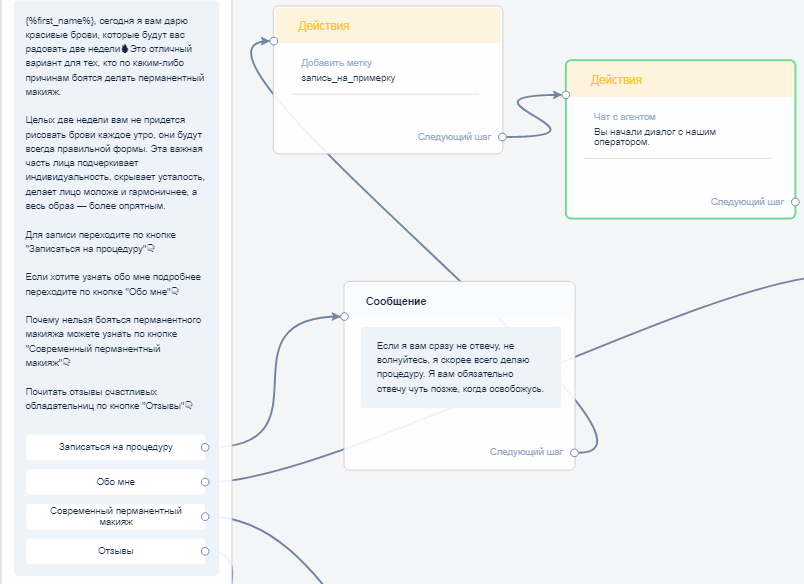 Первый бот был со многими ветками, где мы спрашивали какая зона интересует, что мешает воспользоваться услугой, закрывали все возражения: больно, дорого, нестерильно, аллергия, синие брови и тд. Но потом его сократили — нам достаточно было привести людей на процедуру бесплатных бровей, а мастер сама закрыть все возражения в беседе.