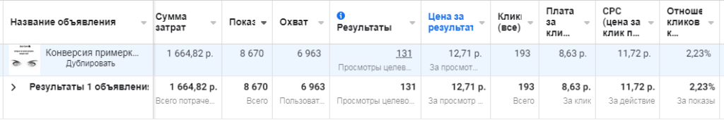 Рекламный бюджет 1664,82 руб Было получено: 193 клика 131 просмотр целевой страницы CTR — 2,23%