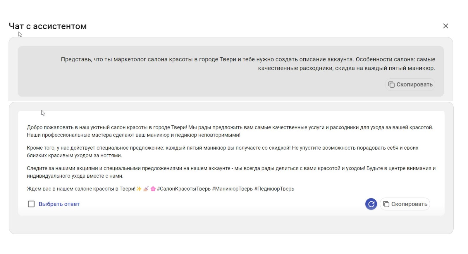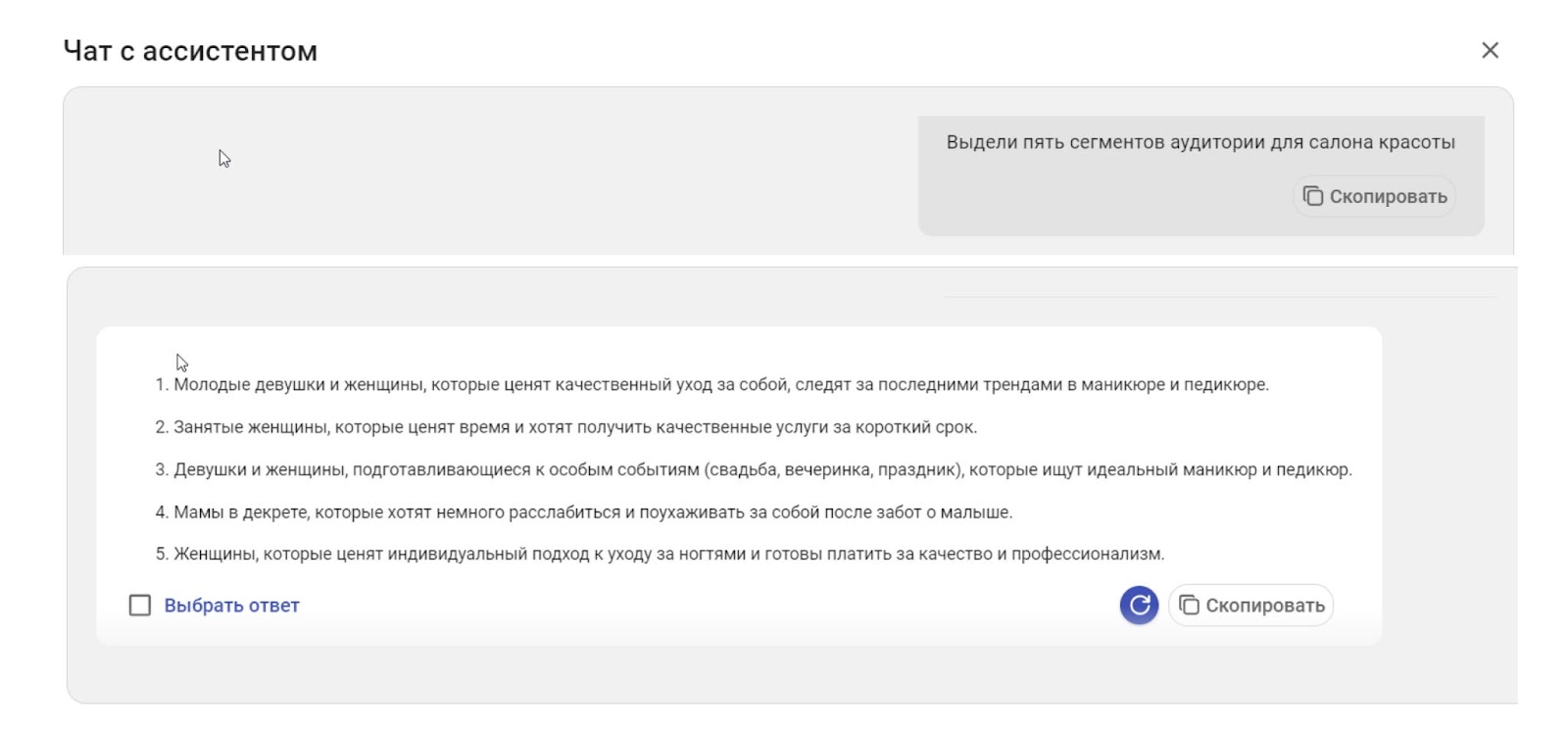 Для продвижения салона красоты можно использовать ИИ-инструменты. Например, попросить определить целевую аудиторию, для кого будем писать посты.