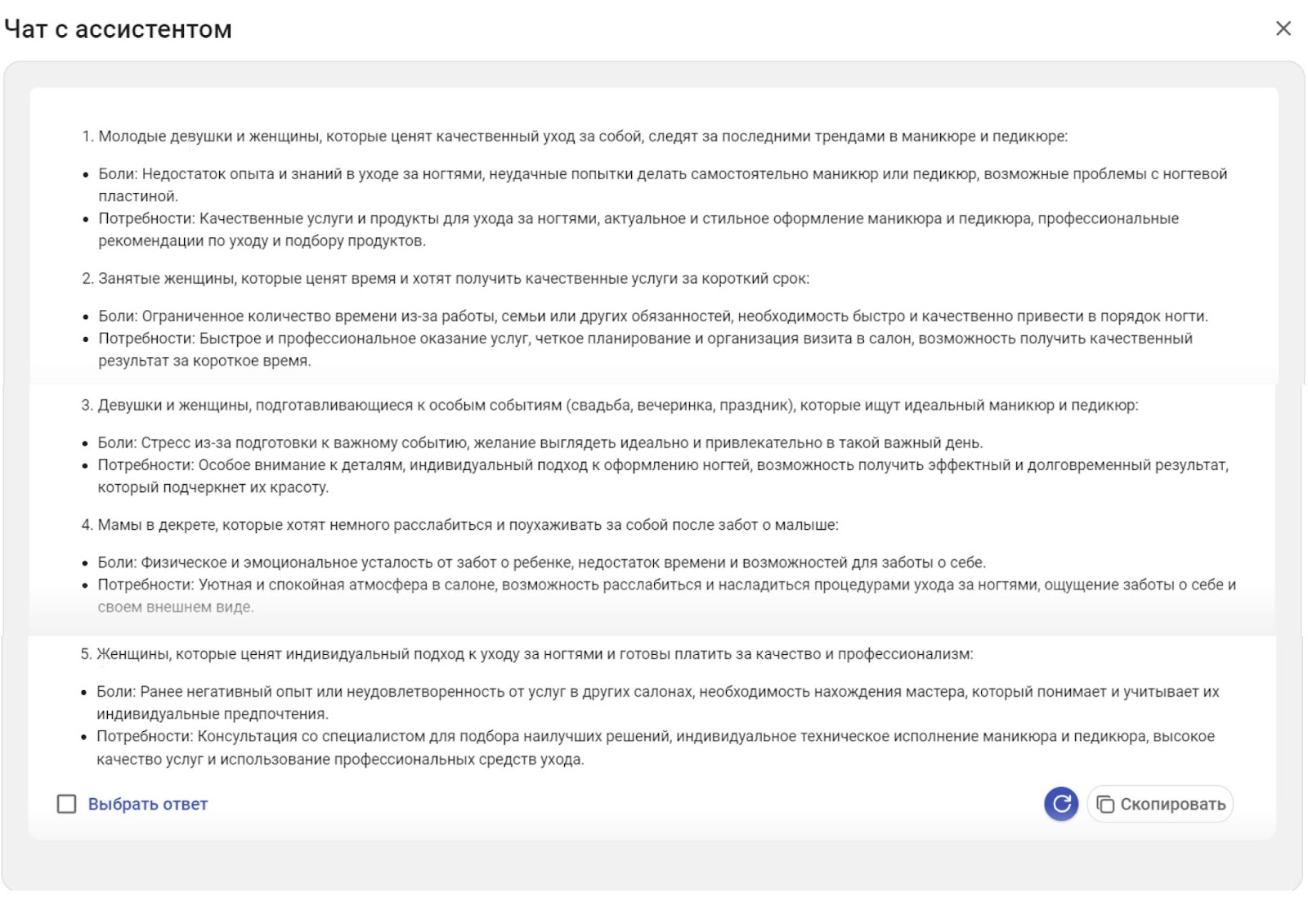 Следующий промт: «Раскрой каждый сегмент, опиши их боли и потребности»