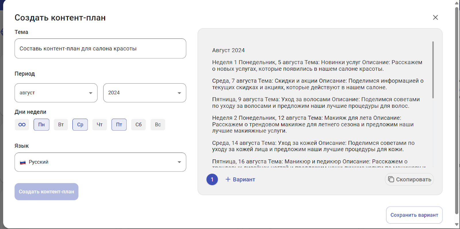 Дальше можно запланировать, в какие дни будете публиковать посты, и попросить у нейросети составить контент-план для салона красоты:
