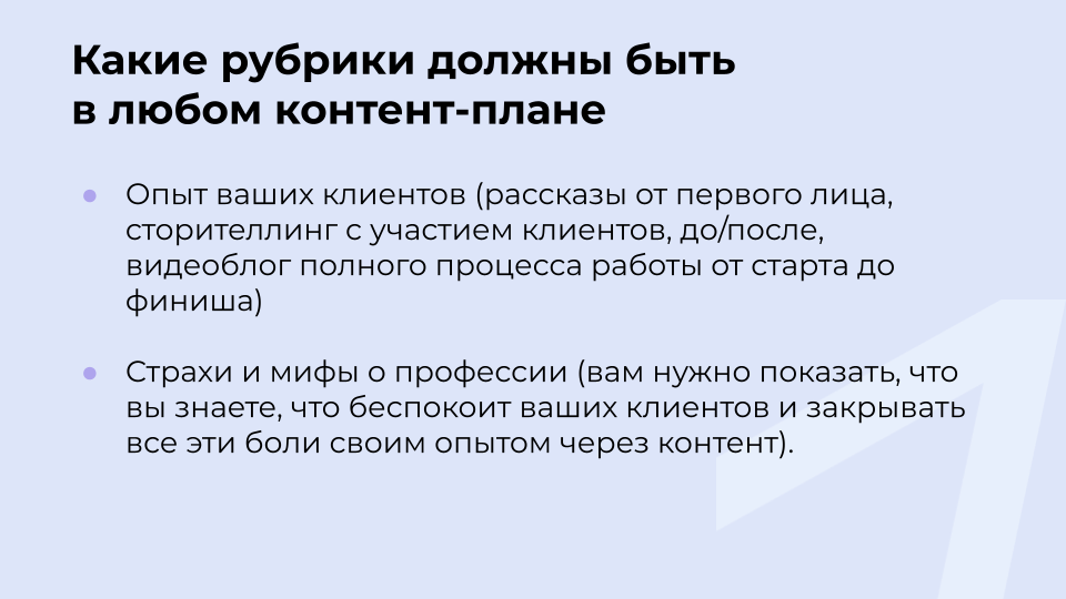 В любом контент-плане должны быть рубрики, раскрывающие опыт ваших клиентов, и контент, раскрывающий страхи и мифы вашей ниши.
