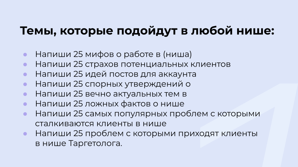 На начальном этапе создания контента сделайте список из тем, которые вы будете использовать. Для этого максимально подробно и в повелительном наклонении напишите нейросети запрос. Например, «Найди 10 самых популярных и актуальных мемов/шуток на данный момент. Укажи оригинальные названия мемов. Придумай, как их адаптировать под нишу таргетолога» и т. д.